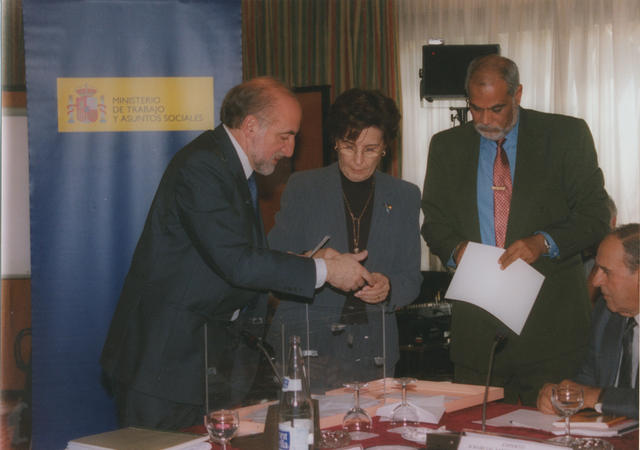 Consejo General de la Emigración. Antonio Maceda, Secretario General de Ordenación de las Migraciones con delegados extranjeros.