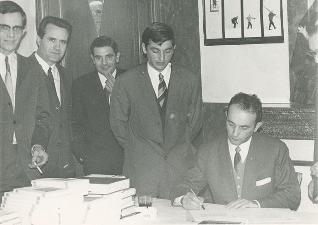 Firma de la entrega del material cultural ofrecido por el Instituto Español de Emigración a la Casa de España en Annonay. De izquierda a derecha; el Cónsul de España en Nimes, Javier Rubio; el Presidente de la Casa de España; José Castro; y varios miembros de la junta directiva