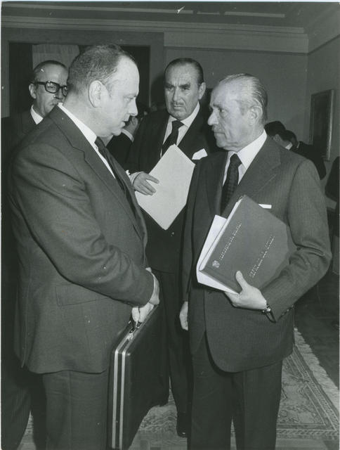 El Presidente del Gobierno Arias Navarro, conversa con el Vicepresidente para Asuntos del Interior y Ministro de la Gobernación, Fraga Iribarne.
