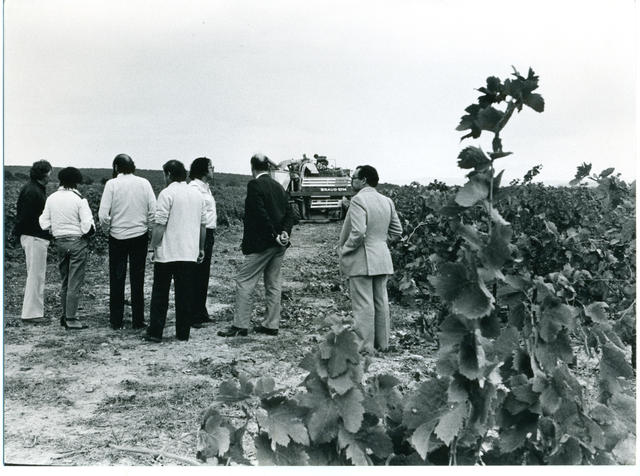 Vendimia 1983. Directivos del Instituto Español de Emigración visitan a los vendimiadores españoles.