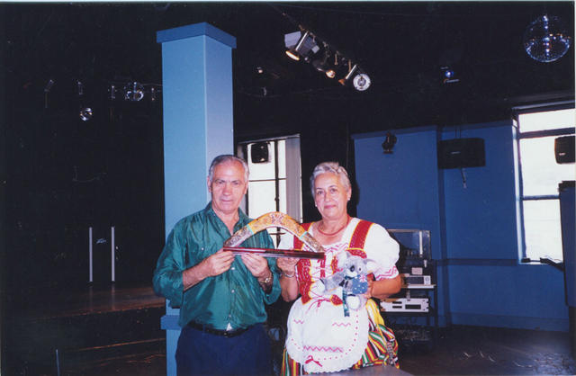 Ana Padrón recibe de manos de Eusebio Morales unos obsequios en nombre del Club Español de Sydney durante el homenaje que se le rindió