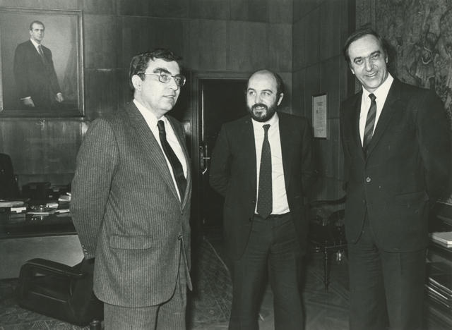 François Autain, Secretario de Estado para la Inmigración de Francia; Joaquín Almunia, Ministro de Trabajo; y un alto cargo de la Embajada francesa, en marzo de 1983