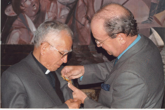 Momento en que el Padre Luis Moreno recibe la Condecoración de la Orden Isabel la Católica por parte del Embajador Andrés Collado