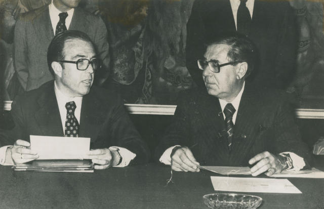 Los Ministros de Asuntos Exteriores de España y México, Marcelino Oreja y Santiago Roel García, anunciando el restablecimiento de relaciones diplomáticas