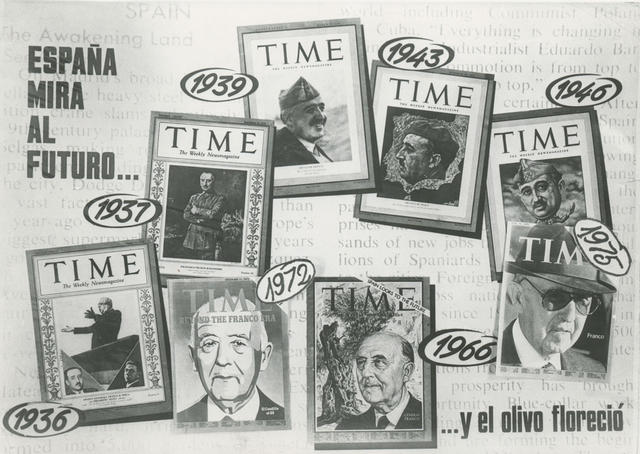Foto composición de las ocho portadas de la revista "TIME" que desde el año 36 ha publicado con la fotografía de Franco. Entre la primera y la última publicación han pasado 39 años y es la figura no americana que más veces ha aparecido en la portada de dicha revista. Publicada número 192