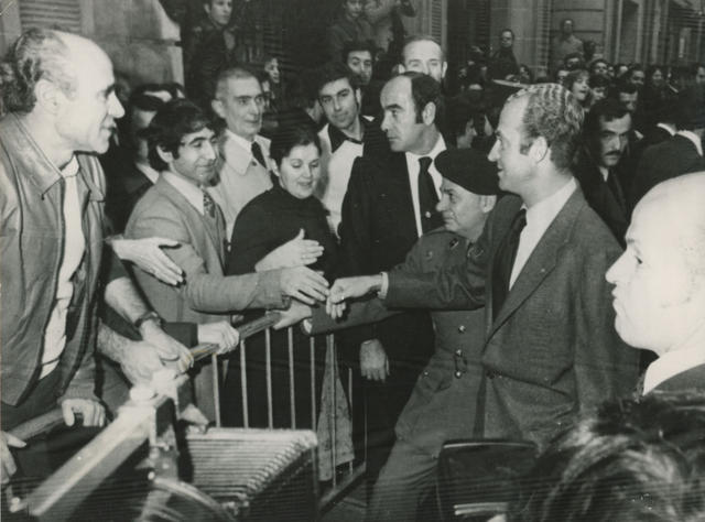 El Rey Don Juan Carlos da la mano a un grupo de emigrantes españoles en el exterior de la Casa de España en París tras el acto inaugural de la misma