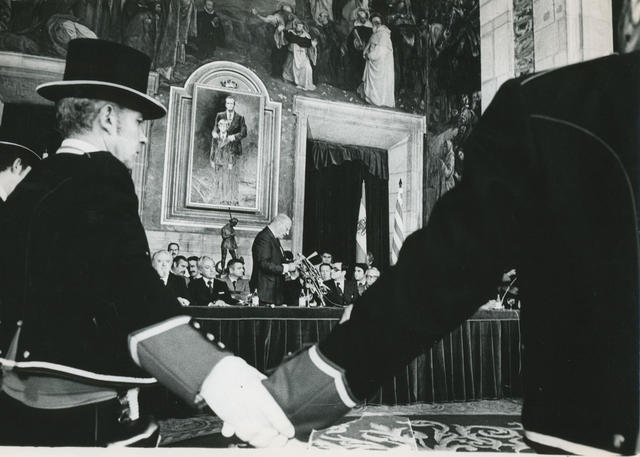 El Presidente de la Generalitat de Cataluña, Josep Tarradellas, pronunciando un discurso