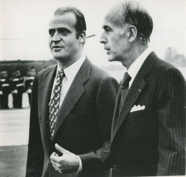El Rey don Juan Carlos charla en el aeropuerto de Orly con el Presidente francés Valery Giscard d'Estain