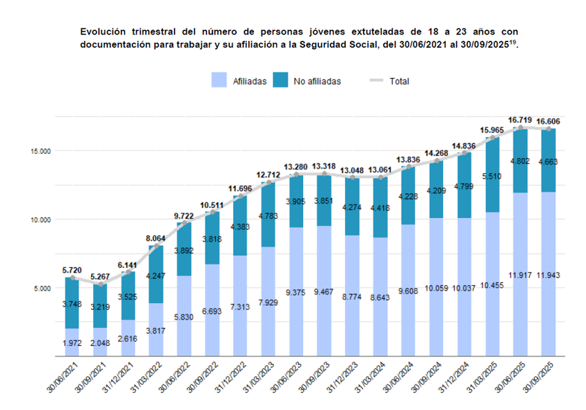 El informe del Observatorio Permanente de la Inmigración recoge un total de 20.116 personas como menores no acompañados o jóvenes extutelados, de 16 a 23 años, con autorización de residencia en vigor en nuestro país a 30 de septiembre de 2025. Esto supone una variación del 19,4% en el último año y un crecimiento absoluto de 12.238 personas (155,3%) cuatro años después de la entrada en vigor de la reforma de 2021.