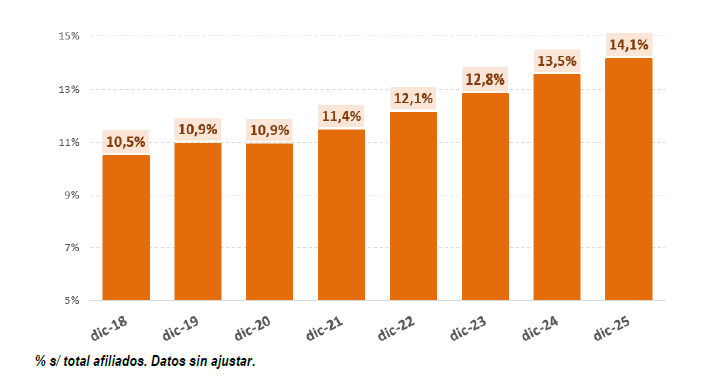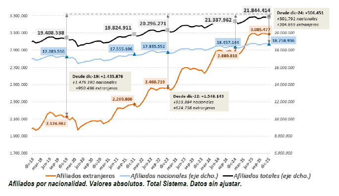 Desde diciembre de 2019, la afiliación de trabajadores extranjeros ha crecido un 45%, encadenando por tercer año consecutivo incrementos superiores a las 200.000 personas. En el conjunto del sistema, los trabajadores foráneos representan ya el 14,1% del total de cotizantes a la Seguridad Social, seis décimas más que hace un año.
