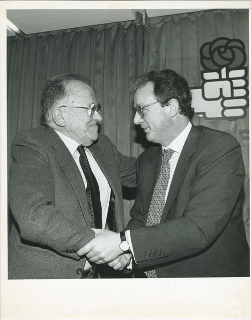 El presidente del PTE, Santiago Carrillo estrecha la mano del secretario de Organización del PSOE, Txiki Benegas, tras firmar un acuerdo de integración del PTE en esta formación.
