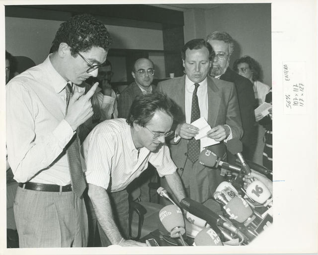 El Presidente de Alianza Popular, Antonio Hernández Mancha, Alberto Ruíz Gallardón, candidato a la Comunidad Autónoma de Madrid y José María Álvarez del Manzano por AP.