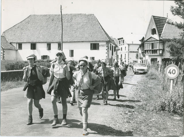 Grupo de Jóvenes de jóvenes muchachas, camino de su campamento.