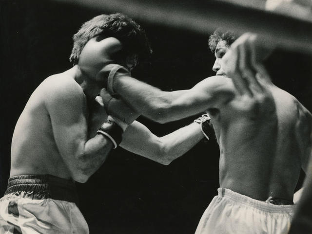 El pugil de los pesos medios, Francis, golpea en la cabeza al almeriense Rubio Melero durante el combate en el que este último quedaría en estado de coma tras haber sido dejado K.O.