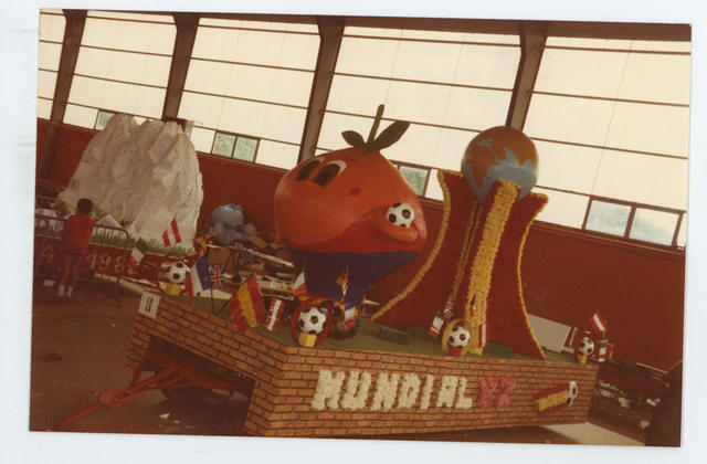 Carroza del Mundial de fútbol 82 con su mascota "Naranjito", en las fiestas de las Rosas de la localidad francesa de Erión, creada por el Centro Cultural Español