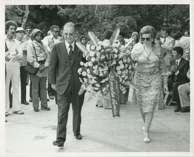 El Cónsul General de España en Puerto Rico, acompañado de su esposa, se acercan a depositar una ofrenda floral en el Monumento a Cristobal Colón