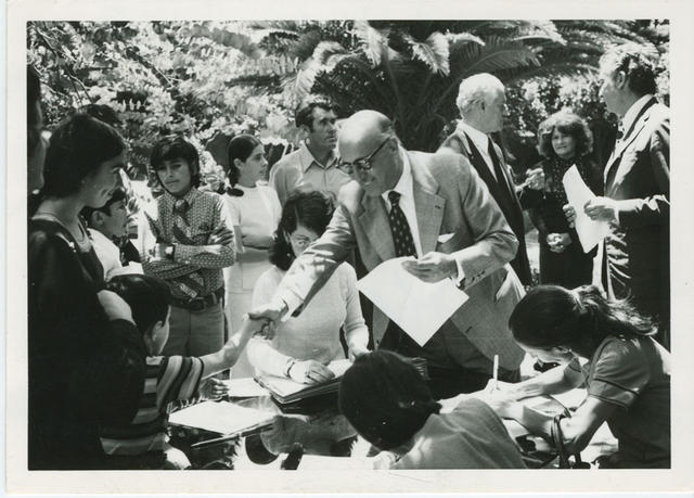 El Embajador de España don Ernesto La Orden entrega a los hijos de españoles las ayudas económicas del Instituto Español de Emigración para cursar estudios. 1974