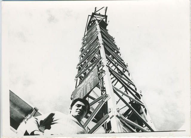 Español al lado de una torre.
