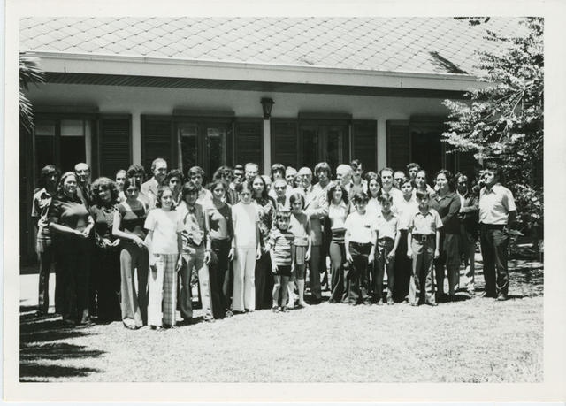 El Embajador de España don Ernesto La Orden entrega a los hijos de españoles las ayudas económicas del Instituto Español de Emigración para cursar estudios. Los niños que recibieron las ayudas posan con sus familiares, el Embajador y su esposa.