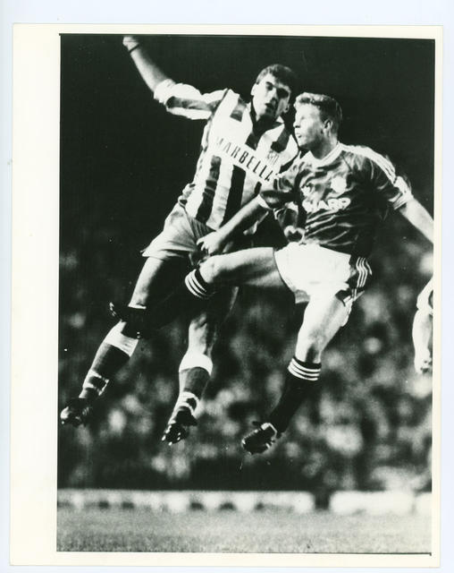 El jugador del Manchester United, Mark Robins jugando contra Manolo, jugador del Atlético de Madrid durante un partido de segunda vuelta de Copa de Europa