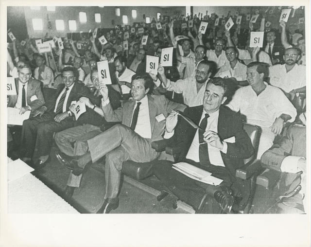 Adolfo Suarez, con la cartulina del SI, durante la votación del informe del Secretario General del CDS, José Ramón Caso durante el II Congreso Nacional del Centro Democrático y Social.