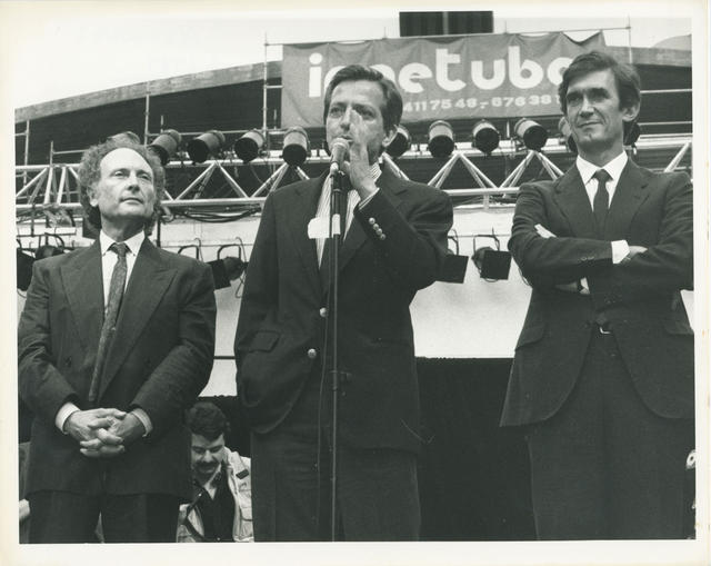 Intervención de Adolfo Suárez, presidente del Centro Democrático y Social, en el mitín de cierre de campaña electoral al Parlamento Europeo. A la izquierda, Eduardo Punset y a la derecha, José Ramón Caso.