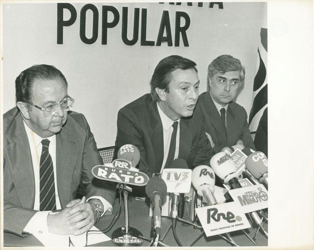 Luis Grandes, Secretario General del PDP, durante la rueda de prensa que ofreció en la sede del partido, rodeado por Iñigo Cavero y Javier Rupérez.