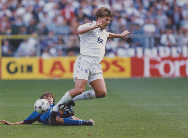 El jugador del Real Madrid, Michael Laudrup, sufre una entrada de un jugador del Tenerife
