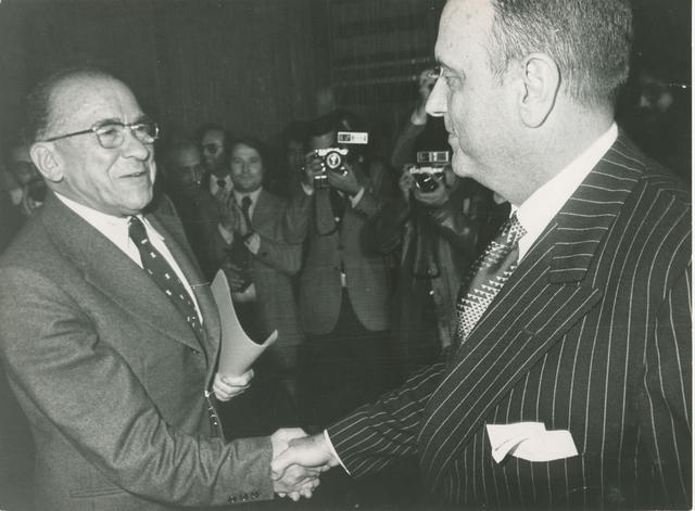 Santiago Carrillo con Manuel Fraga saludándose.