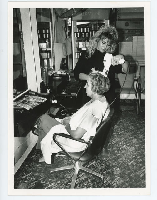 Una peluquera secando el pelo a una clienta