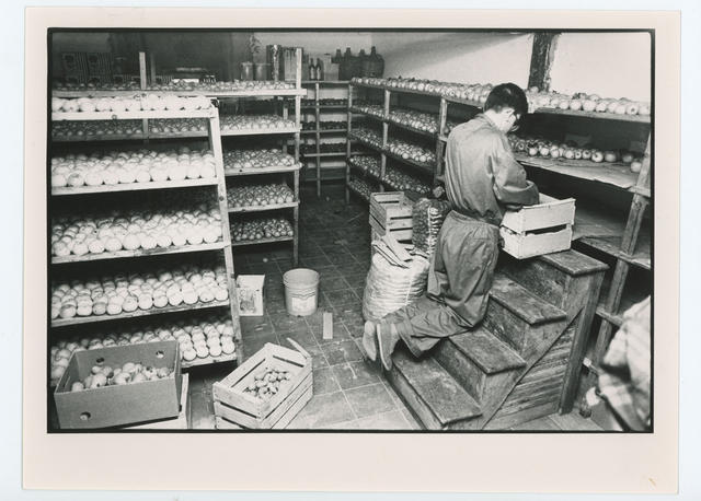 Un trabajador en el almacén de manzanas de Santo Domingo de Silos