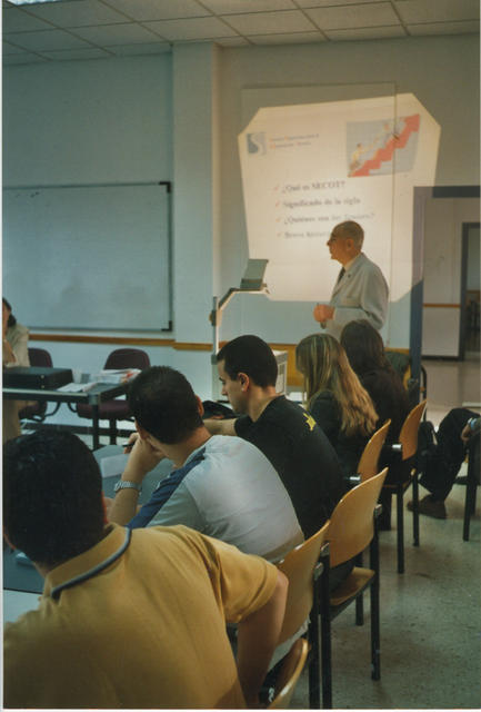 Un ponente explica lo que es SECOT en un momento de su intervención en el curso de formación sobre emigración. Publicada.