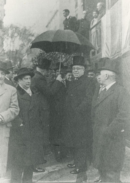 Manuel Azaña en un acto oficial, junto a Marcelino Domingo y Claudio Sánchez Albornoz