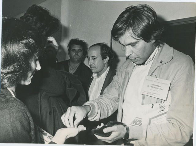 El ex-secretario del PSOE, Felipe González, comprando "El Socialista", momentos antes de comenzar el Congreso Extraordinario Provincial de la Federación Socialista Madrileña.