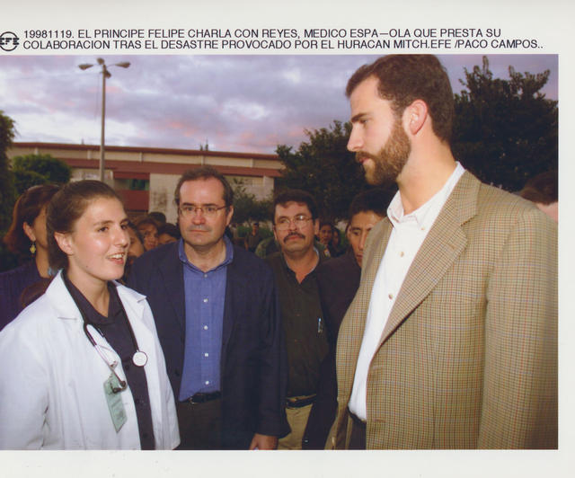El Príncipe Felipe charla con Reyes, médico española que presta su colaboración tras el desastre provocado poe el huracán Mitch