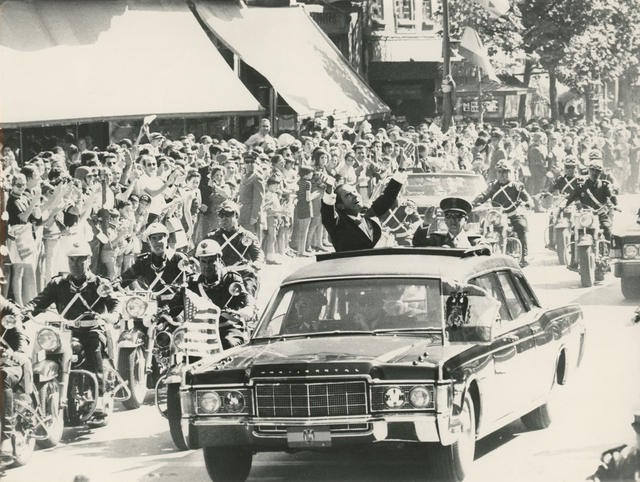 Instántanea de la bienvenida oficial tributada al Presidente Nixon en Madrid hasta llegar al Palacete de la Moncloa.
