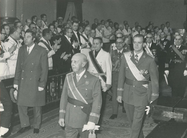 Momento de la llegada del Generalísimo acompañado por el príncipe Juan Carlos al pleno inaugural del Consejo Nacional del Movimiento de la Alta Cámara