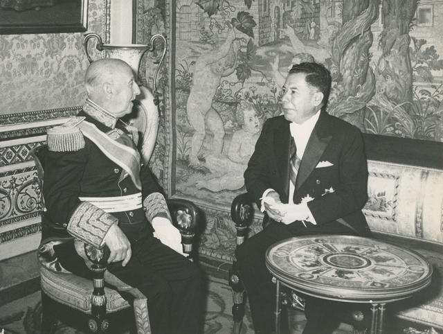 Instantánea de Francisco Franco acompañado por el nuevo Embajador Extraordinario y Plenipotenciario de Guatemala en España, Doroteo Reyes Santa Cruz