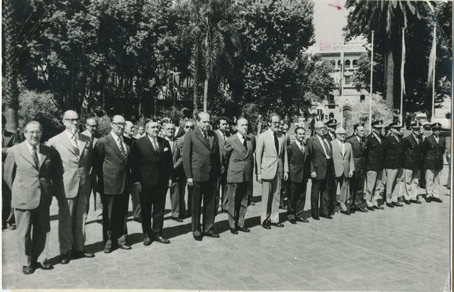 Un momento del Homenaje rendido al General San Martín por el Embajador de España en Buenos Aires, D. Gregorio Marañón Moya. A su derecha el Interventor Federal y a su izquierda el Cónsul de España en Mendoza, D. Ricardo Peidró Conde. Publicada en el nº 180 pag 26.