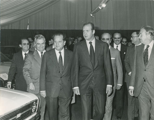 El Rey Don Juan Carlos, acompañado de Henry Ford y del Ministro de Industria, don Carlos Pérez de Bricio, durante la inauguración de la factoría Ford en Almusafes