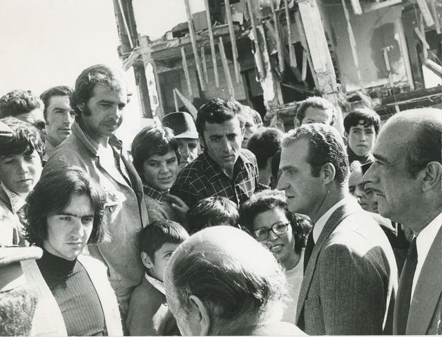 Los Príncipes de España durante su viita a la zona dañada por las inundaciones y la riada en este pueblo murciano. Durante su visita fueron acompañados de los Ministros de Relaciones Sindicales, Comercio y otras personas y autoridades