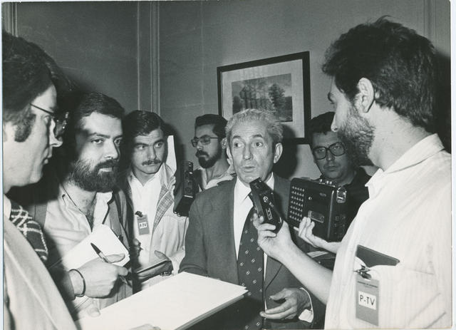 Lider de Comisiones Obreras Marcelino Camacho conversa con los periodistas poco antes de entrar a la reunión.