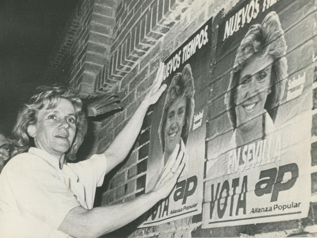 Retrato de Soledad Becerril, candidata a la Alcaldía de Sevilla, como independiente dentro de la candidatura de Alianza Popular, pegando los primeros carteles en esta ciudad al iniciarse la campaña electoral