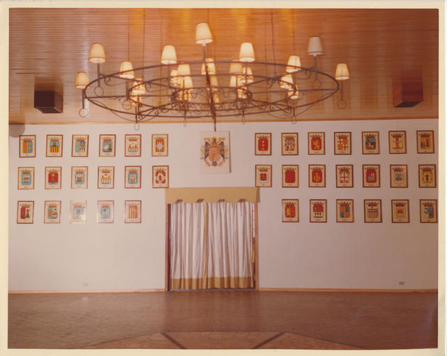 Vista de una de las partes de la pista de baile decorado con los escudos de las provincias españolas en estilo colonial del Centro Español del Paraná Curitiba