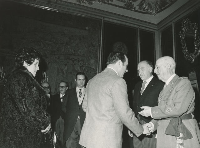 Instantánea del Jefe de Estado haciendo entrega al matrimonio formado por Mariano Robles y Manuela Ortega, de Valladolid, del primer premio nacional de hijos vivos, que cuentan con 19 hijos y los vivos 19