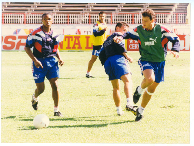 Los jugadores del Atlético de Madrid, Vizcaíno y Fortune, durante un entrenamiento en el estadio Vicente Calderón, disputando un balón ante la mirada de Solozábal