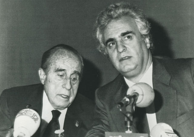 Retrato de Pedro Rius y Fernando Múgica en una rueda de prensa