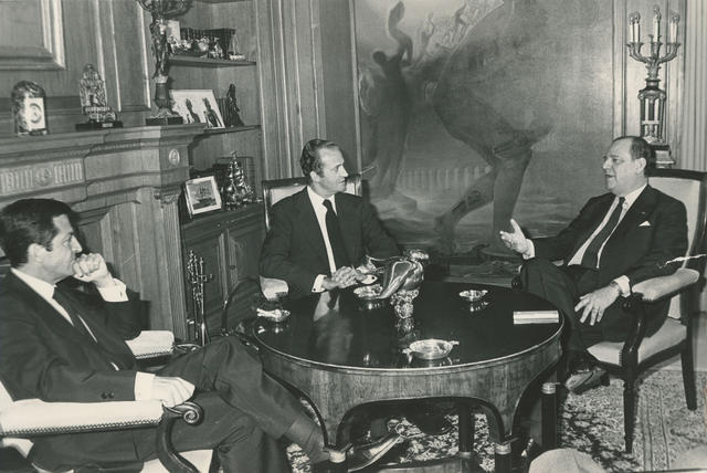 Retrato del ministro francés Raymond Barrf durante la audiencia con el Rey Juan Carlos I en el Palacio de la Zarzuela junto con el presidente del Gobierno Español Adolfo Suárez