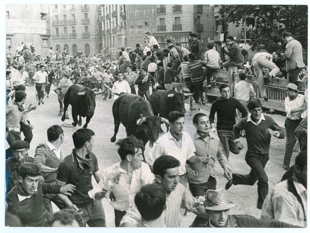 Instántanea de una de las carreras de San Fermín, durante los encierros de Pamplona