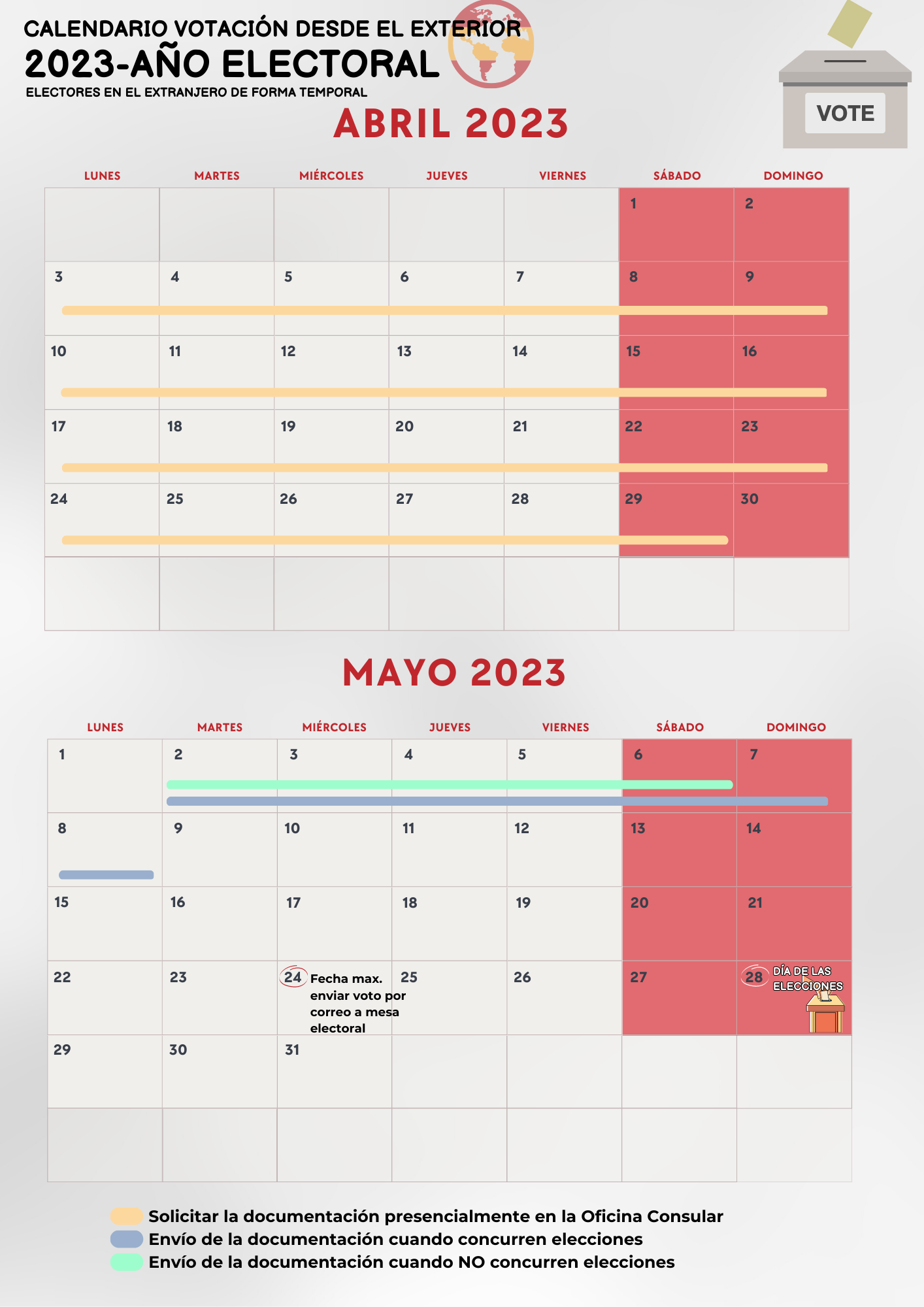 La Oficina del Censo Electoral enviará de oficio la documentación para votar a los electores en el extranjero entre el 22 y el 28 de abril. Además, se habilita un enlace para descargar las papeletas por vía telemática y hasta el 23 de mayo se podrá enviar el sufragio por vía postal al consulado.